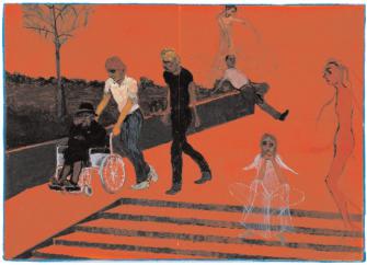 Liebe ist ein abstraktes Bild aus aufgeklebtem, Falten schlagendem golddurchwirktem Papier, abstrakt auch Das neue Leben, horizonale malerische Streifen in Grün, und Ewigkeit. Verstörend Makabres dazwischen: ein zerstückelter und gepfählter Kinderkörper im Schoß eines Jungen, drastisch neben der collagierten Abbildung einer effizienten Arbeitswelt. Die Verletzlichkeit des menschlichen Körpers in der Phantasie nach vorne abgewinkelter Unterschenkel, die das Skelett entblössen, eine fragile Gestalt bodenlos, ohne Halt. Glück und Armut: beinahe ironisch zwei kauernde Gestalten, die eine stülpt der anderen einen Eimer über den Kopf, ein schlacksig rotlangbeiniges Mädchen passiert – und er will alles sehen... Ein Eltenpaar, dazwischen das Kind: die biedere Rückenansicht der Mutter, der Vater, die Zeitung lesend, mit Rattengesicht ein Intellectus moribundus, nur das Kind erkennt die Christusgestalt in Gold und Blau mit Lichterkranz, die Male an Händen und Füßen tragend.