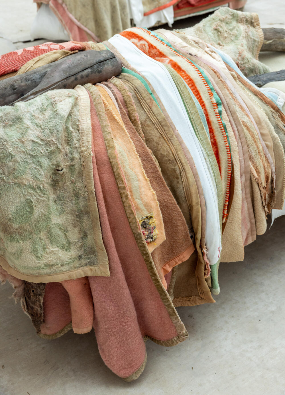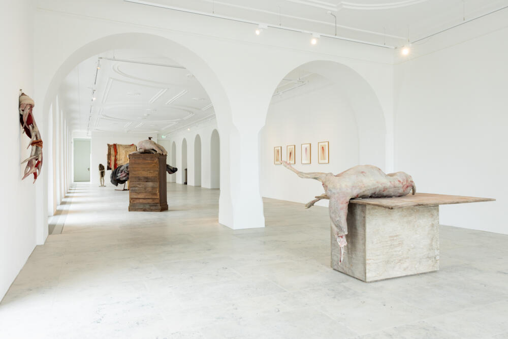 Im Münchner Saal bleibt der Blick auf das Motiv des Engels konzentriert. Die zentrale Gestalt, speziell für diese Ausstellung geschaffen, ist Liggende – Arcangelo III, 2023, ein auf einem Sockel aus gebrauchten Bodenbelägen zusammengebrochener Engel. Er ist umgeben von einer Auswahl sehr früher Arbeiten und Skizzen, die hier zum ersten Mal gezeigt werden und das Thema des Engels wie des Flügels in Berlinde De Bruyckeres Oeuvre reflektieren.