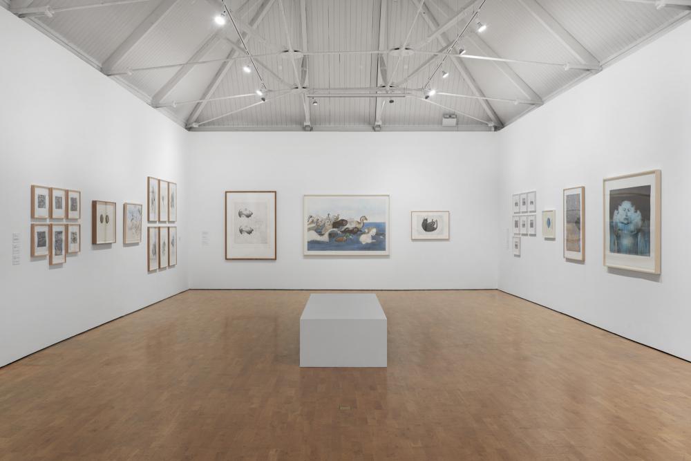 There is an abundance in Kiki Smith’s choice of materials. The exhibition emphasises her material experimentation, from bronze, plaster, glass, and porcelain to paper, pigment, aluminium, latex, feathers, and beeswax amongst countless others – demonstrating her constant curiosity and desire for discoveries. A major focus of the exhibition has been placed on three distinctive areas of Kiki Smith’s work: the small sculptures, a selection from her printmaking oeuvre, and the Jacquard tapestries.