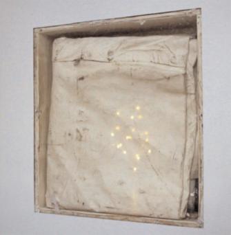 Man könnte auch vermuten, das Falten sei archaische Handlung. Was hat das zu bedeuten, wenn der Künstler die bemalten Leinwände faltet? Ein-fältig, zwei-fältig: es entstehen Kraftlinien, Energiefelder, die Form des Kreuzes, eine Dichte der Dimensionen von Fläche, Tiefe und Zeit. Aber Lawrence Carroll illustriert keine religiöse Praxis und nicht archaische Muster. Er schafft eine eigene Welt. Es ist ein Verständnis von Malerei, das geradezu märchenhafte Züge trägt. Bilder legen sich "schlafen". Eine einfache, beinahe naive Vorstellung: Bilder sind lebendig. Sie leiden, atmen, schwitzen. Sie legen sich zur Ruhe. Sie sind gefaltet, gebettet, verstaut, versenkt in der Wand. In der Faltung bewahren sie ihr Geheimnis. Schlaf, Traum, Trance, Erinnerung, Aufbewahrung, Vergessen. Was verbergen sie? Was umhüllen sie? Falten meint nach dem Philosophen Leipniz: Vermindern, Reduzieren, "Rückkehr in die Tiefe der Welt" (1687, nach Gilles Deleuze). Jede Box ist ein Raum der Stille. Verschlossen und doch geöffnet: die Oberfläche ein Fenster, in das Licht fällt. Stillstand der Zeit. Innerlichkeit des Raums. Höhle. Schlafender Keim. Komprimierung, Schichtung, Energie. Von den Faltungen der Materie zu den Falten in der Seele? Was ruht in der Schatulle? Was ist drinnen, was draußen, was privat, intim, was öffentlich?